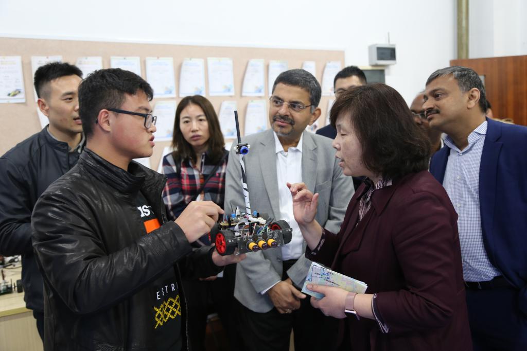 在物联网大学生创新实践基地,基地负责人肖志勇、院分团委书记吴介绍了学生创新实践的总体情况,着重介绍了学院以各类学生创新俱乐部为平台,通过开展各类创新普及讲座和创意开发类活动,激励大学生参加创新实践类项目、参加ACM-ICPC国际大学生程序设计竞赛等各类高水平竞赛,在实践中锻炼学生创新能力的做法。随后,调研团参观了智能汽车俱乐部和机器人俱乐部,对学生课外实践活动表示出较大的兴趣,并与学生进行了交流。