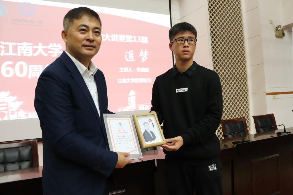 学生会代表全院学生向朱康建赠送了一幅画像作为纪念。在雷动的掌声中,讲座圆满结束。