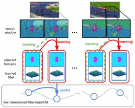 本次竞赛中,IJLPRCI团队所使用的核心算法是基于该团队所提出的特征选择跟踪模型LADCF。该模型的新颖之处在于利用目标和背景的互补信息,自适应地优化出最具鉴别性地空间特征;结合时序图像序列的平滑性,保持不断更新的跟踪器能够始终处在一个较低维度的流形空间上。在此模型基础上利用深度特征实现在复杂场景中的有效跟踪,算法示意图如图2所示。