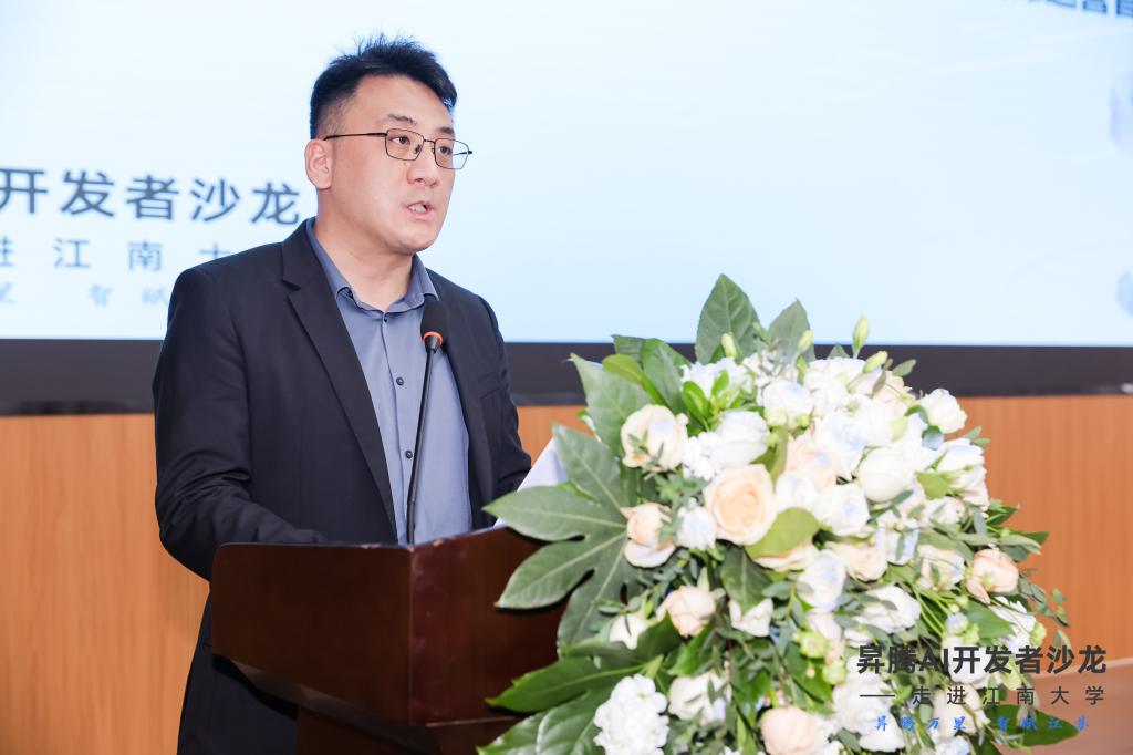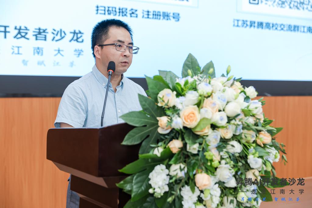 教学副院长陶洪峰代表学校致欢迎词。陶院长指出华为昇腾作为人工智能领域的一颗璀璨明星,正以其强大的技术实力和创新能力,引领着行业的发展潮流。此次开发者沙龙的举办,为江南大学的广大师生提供一个和昇腾领域专家交流、合作、创新的平台,并结识更多致力于昇腾人工智能领域开发的朋友。陶院长鼓励大家携手共进,共同打造一个充满活力、创新无限的人工智能生态,一起探索人工智能的无限可能。