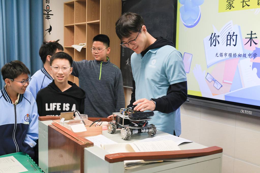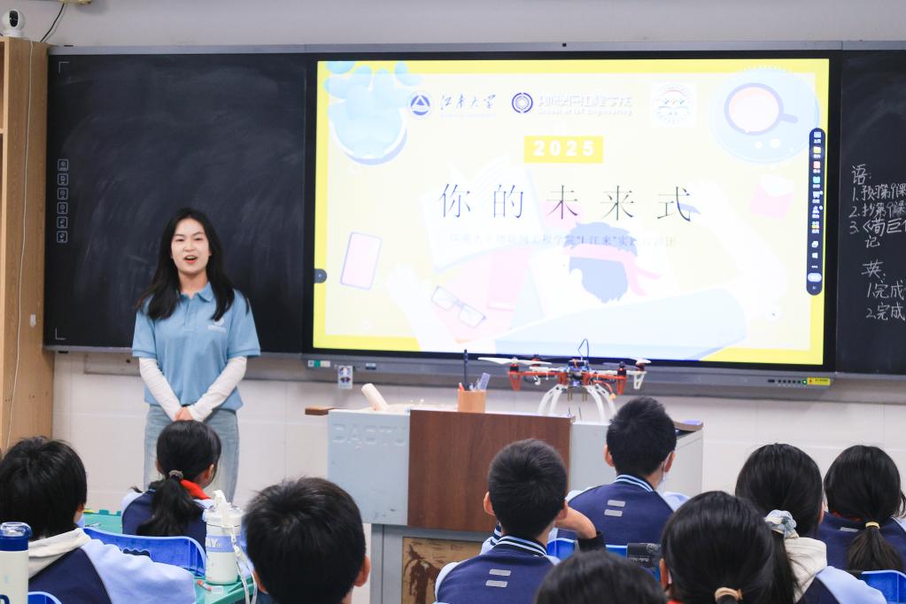 此外,宣讲团成员还设计了丰富的生涯体验活动,带领学生探索自身的同时,帮助他们找到个人特质与社会需求的契合点。整场活动将科技创新思维与生涯教育理念有机融合,使学生在体验中认识自我、在互动中思考未来。来自初一(2)班的胡栋鑫小朋友表示,这次活动让自己开始认识到职业规划的意义所在,课堂上的互动游戏让他觉得既有趣又受启发,也让他意识到要从现在开始更加努力学习、认真听课,希望未来能够成为一名卓越的无人机工程师,用科技的力量建设更加美好的祖国。