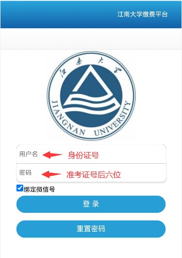 硕博连读考生不用缴费,其他考生须网上支付博士复试费,每人80元。考生搜索微信公众号“江南大学财务处”,“业务办理”中选择“学生缴费”,或登录“江南大学网上缴费平台”(网址://pay.bet365cnurl.com/payment/);登录账号为身份证号,登录密码为准考证号后六位(友情提醒:考生账号已开通,切勿自行注册)。