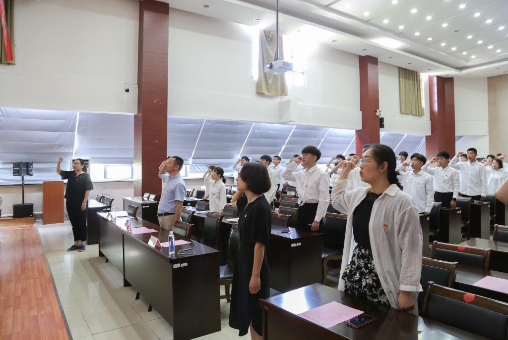在D328会议室举行“七一”新党员宣誓仪式暨专题党课学习。学院党委书记耿向阳、副书记兼副院长孔丽丹、辅导员代表李灿以及45名新发展学生党员参加活动。大会由学院专职组织员孙小芳主持。