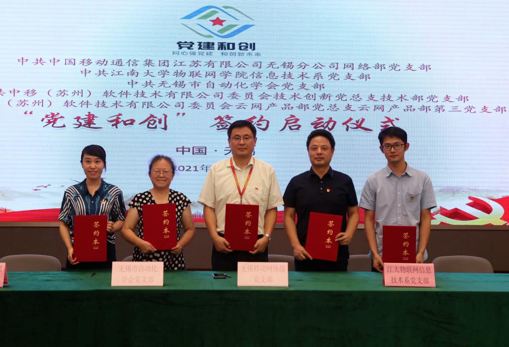 信息技术党支部联合无锡市自动化学会党支部、中国移动通信集团江苏有限公司无锡分公司网络部支部委员会、中移(苏州)软件技术有限公司委员会云网产品部党总支云网产品部第三党支部、中移(苏州)软件技术有限公司委员会技术创新党总支技术部党支部,联合开展了“5G+云+物联网”联盟党建和创主题实践活动,现场完成了揭牌仪式和签约。
