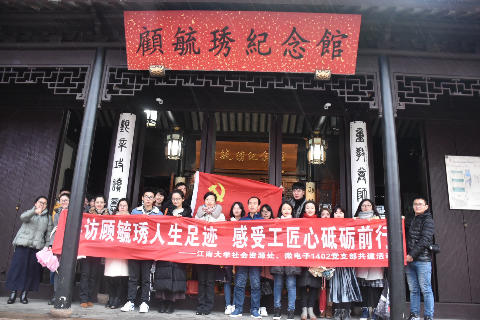 顾毓琇老先生的故居大门为五扇对开式,进门迎面便是顾老先生的半身铜像,领路的同志带领穿过了惟善堂、燕誉堂、诵芬堂等,并以此从顾毓琇先生的生平经历、科教泰斗、文坛大家、成才之路、爱国情深五个方面来详细讲述这位学术大师的传奇故事,顾毓琇先生的生平仿若一一印入眼帘。此外,支部成员还有幸亲眼见到顾老先生的真迹,无论是书法,还是绘画,均是大家之作。顾老先生无论在物理学方面的高深造诣,还是文学艺术方面的伟大成就,先生身上所展现出的文、理的完美融合都不得不让人为之震撼。江南大学社资处、江南大学教育发展基金会党支部窦新华老师不禁赞叹道:顾老先生真是了不起!多才多艺,旷世奇才!相比之下,我们大家向顾老先生学习的地方太多了!微电子1402党支部书记何劲赞同道:“我们要向顾老先生学习,做一个全面发展的人,以全面发展的自我进而提升更优秀的自我。”支部杜鑫同学表示:“顾老先生的爱国情怀正是我们共产党员需要时刻保有的情怀,无论我们远在他乡,都一定要怀着一颗为中华民族贡献力量的信念。”支部李贺珈同学表示:“每个教育者都是无私的,值得我们尊敬。我们每个人都是一位教育者,虽然没有像顾先生这样渊博的知识与造诣,但“三人行,必有我师”,我们可能每时每刻都在对别人形成影响。所以,作为党员,我们要谨言慎行,做好先锋模范作用。”辅导员许金红老师感慨道:“求学最重要的就是具有工匠精神和开拓创新精神,我们党员同志更应该带头去弘扬和发展这一精神,只有越‘新’,才会越‘强’”。