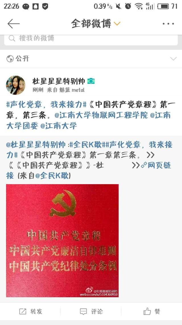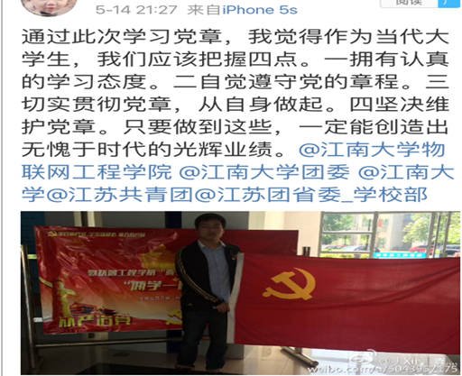 在“声”化党章党日活动中,指导学生党员朗诵党章党规并制作成小音频上传网络,并@物联网学院、江南大学等官方微博,巧妙的将传统的朗诵与“互联网+”思维相结合。通过该活动,让党员们诵读党章的过程中受到了深刻的政治理论和党性知识教育。
