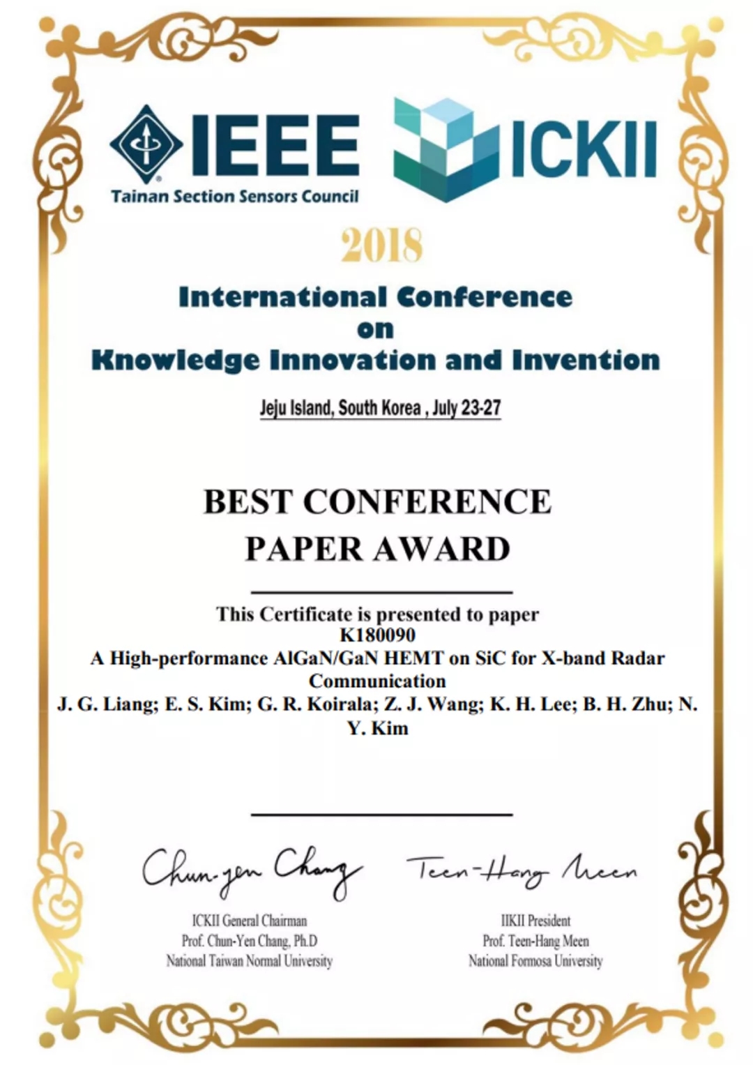 2014年,梁峻阁老师在本科毕业后经选派前往韩国光云大学直博,从事射频集成电路设计与传感检测技术等研究,硕博四年内以第一作者身份累计发表SCI 9篇,多次参加国际学术会议并获奖,为中国留学生做出了表率。