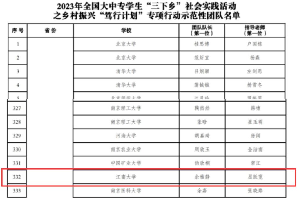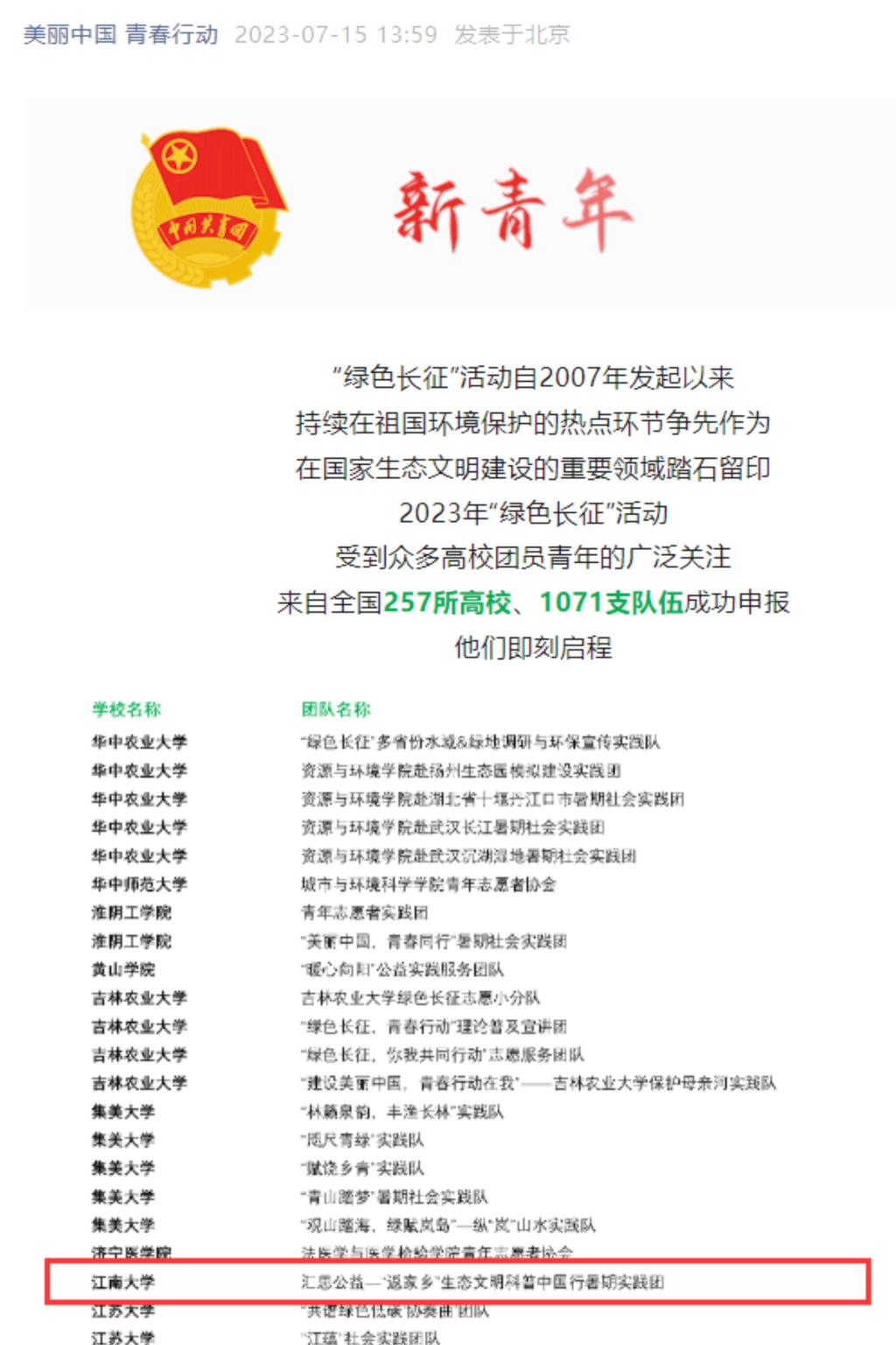 积极组建团队参加国家级暑期社会实践专项团队申报,经过层层选拔,由屈跃宽老师指导,依托江南大学汇思公益团组建的“汇思公益——返家乡生态文明科普中国行暑期实践团”成功入选2023年乡村振兴“笃行计划”专项行动全国示范性团队和“美丽中国·青春行动”2023年青少年绿色长征科考实践活动,两个专项活动均为江南大学唯一入选的团队。由王志顺老师指导的“赴新疆岳普湖县推普助力乡村振兴服务队”入选2023年“推普助力乡村振兴”全国大学生暑期社会实践志愿服务活动。