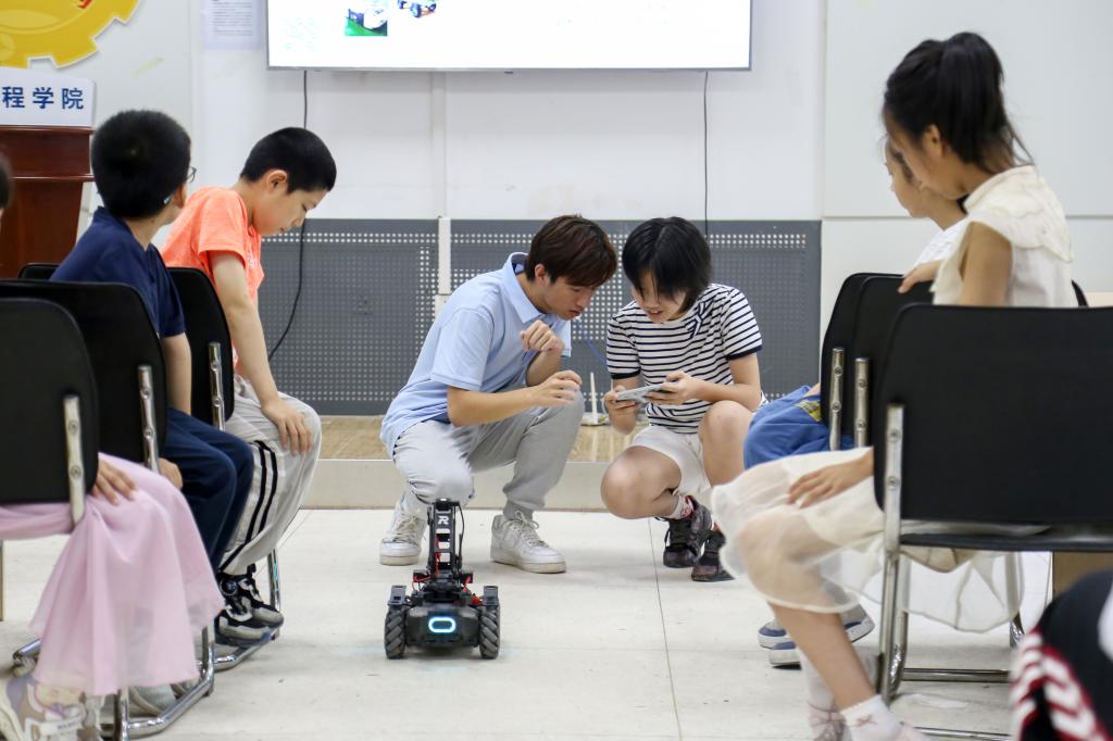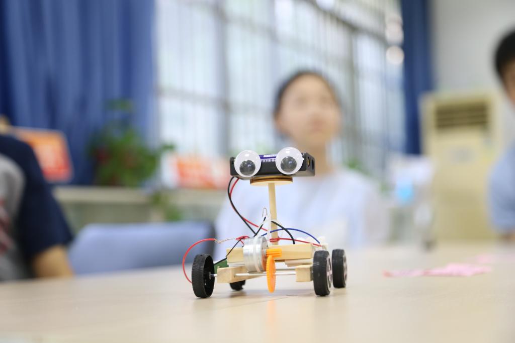 智能车俱乐部自主研发的作品——“无线智能机械臂小车”压轴登场,原地360度转弯、横向纵向平移、机械臂抓取矿泉水瓶,一套套“高阶”操作不断刷新小朋友们对芯片的认知,过了一把“含金量”十足的芯片“瘾”。