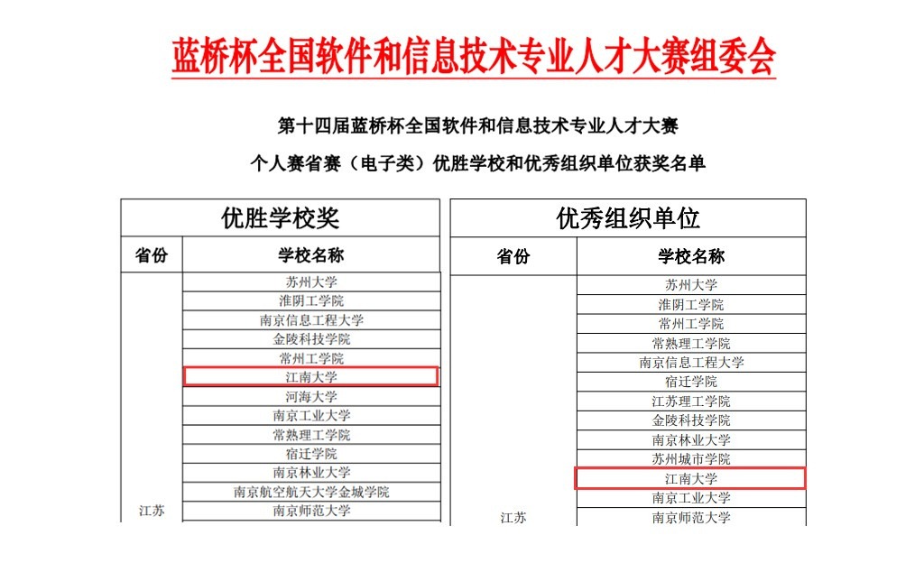近日,第十四届“蓝桥杯”全国软件和信息技术专业人才大赛江苏省赛电子类赛道落下帷幕。江南学子共获电子类奖项69项,其中一等奖16项、二等奖27项、三等奖26项,16人取得国赛参赛资格,江南大学获评电子类“优胜学校奖”和“优秀组织单位”。