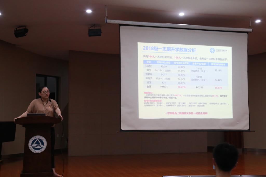 会上,孔丽丹作就业升学指导。她从当下毕业生就业升学面临的新形势、新机遇、新挑战入手,通过大数据对比,对当前就业升学环境作客观分析与解读,并对2023届毕业生提出殷切希望和美好祝愿。结合升学、就业两个主要毕业去向,她建议意向升学的同学要学会提前调研,充分获取信息,在进行研究生报考的学校和专业选择时,要结合学校的专业实力、学科发展前景、导师配备等因素,选择适合未来发展的学科平台继续深造;意向就业的同学要树立正确的就业观念,既要提高就业实战技能,又要积极把握就业时机。“学院永远是大家的坚强后盾!”孔丽丹勉励在座同学,朝着自己的目标奋力冲刺,也欢迎更多的物联学子留校读研,为学院学科建设添砖加瓦,贡献智慧。