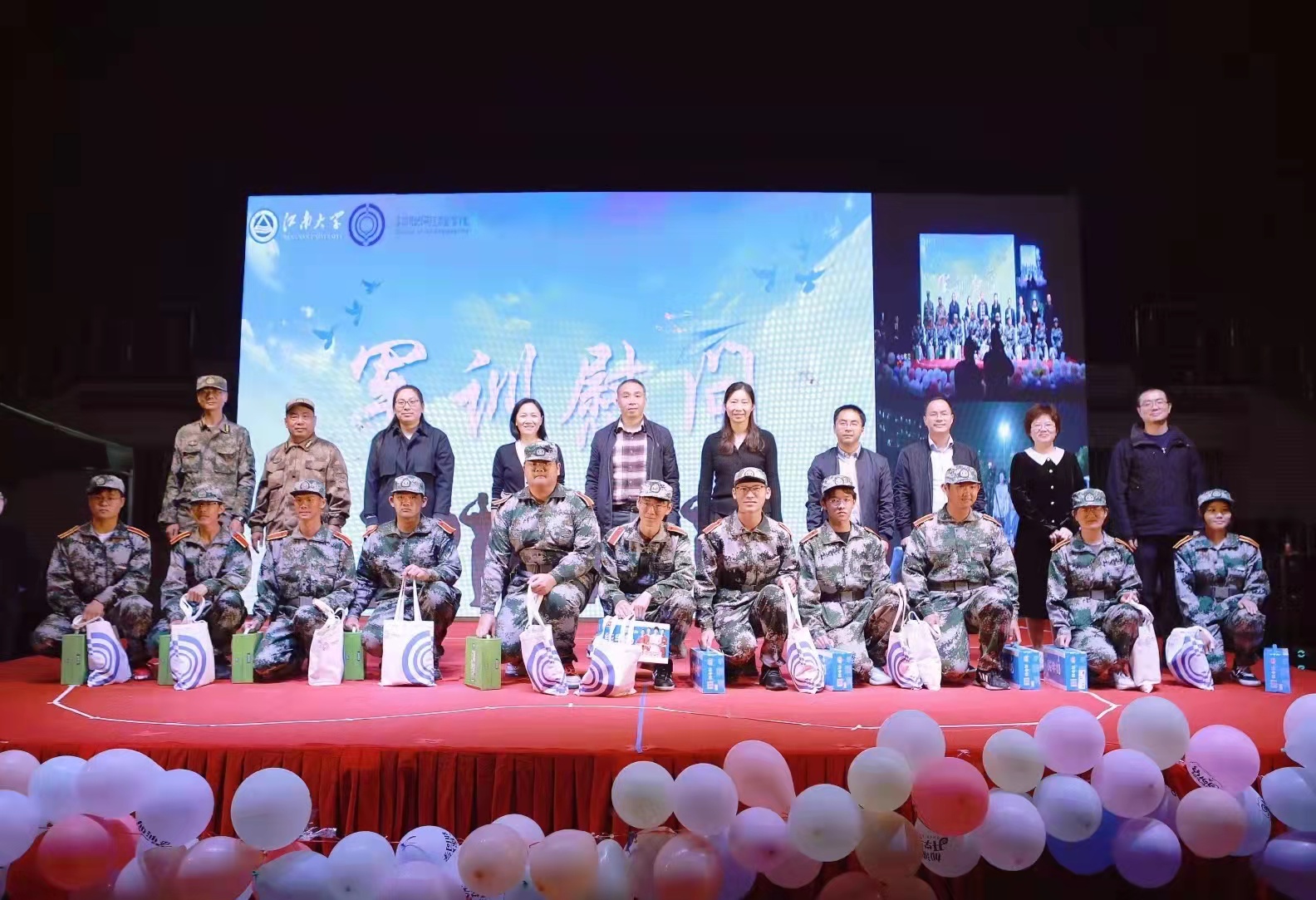 晚会伊始,学院党委书记程捷音致辞。程捷音首先代表学院全体师生向2021级新生表示热烈的欢迎。讲话中,她引用《功勋》中袁隆平给学生们的寄语,殷切希望同学们要做一颗健康的种子,身体、心理、情感都要健康,学院愿给予大家优质资源,帮助学生在江南大学展示最美好的自己。最后,她向所有承训教官表达了衷心的感谢,并同出席本次活动的学院领导和人武部老师向教官、学生送上慰问品。学生们热烈鼓掌,展现了浓浓的师生情。