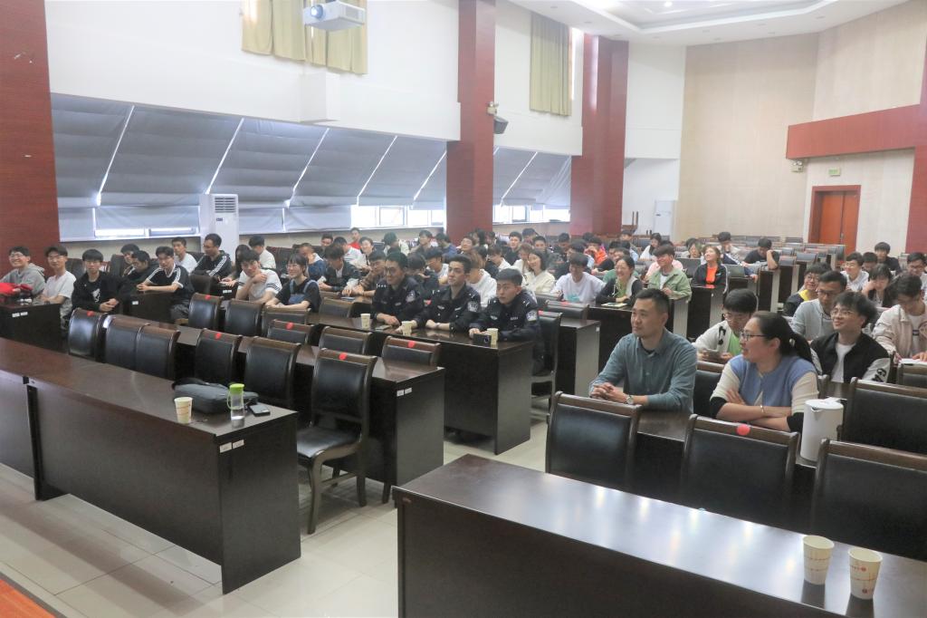 在学院D328召开大学生安全教育大会,邀请滨湖区警官刘惠亮担任主讲嘉宾,全体班团干部参加活动。大会由学院党委副书记、副院长孔丽丹主持。