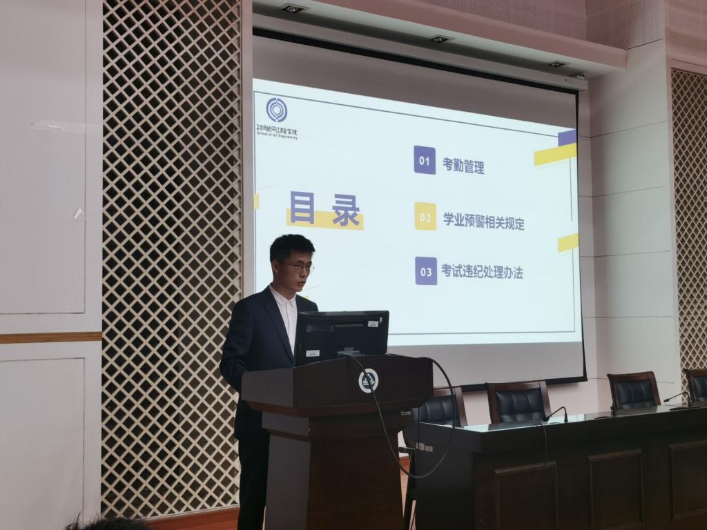 院学习促进中心邵波解读《学生手册》中学风建设相关规定。从考勤管理、学业预警相关规定与考试违纪处理办法三个方面,提醒同学们在日常学习生活中严于律己、守住底线。物联网1902班学习委员吴朕铠、自动化2006班学习委员李庆民依次作班级学风建设经验分享,从精确考勤、课下答疑、组织模考、学业帮扶等多个维度,介绍自己在学习委员岗位上的工作方法和特色,为其他学习委员开展班级学风建设提供参照、拓展思路。随后,院学习促进中心施宇辰对“启智”本科创新人才培养计划的实施方案进行解读,从活动背景、培养模式、考核管理等方面介绍“启智”项目的顶层设计,并结合第一次月报的数据统计情况,指出提质增效的努力方向,面向同学们提出“聚焦学习投入度、发挥主观能动性”的倡议。