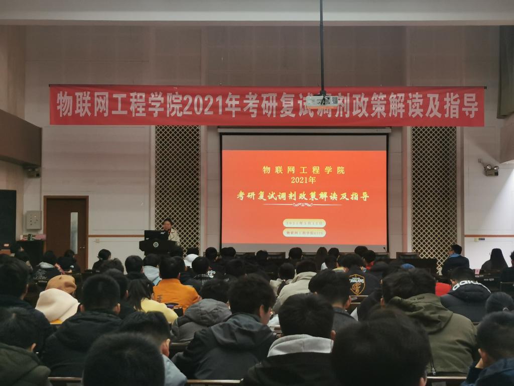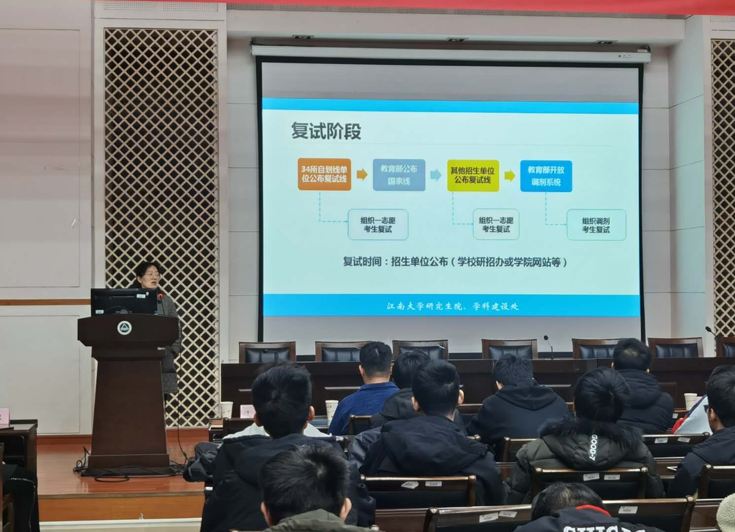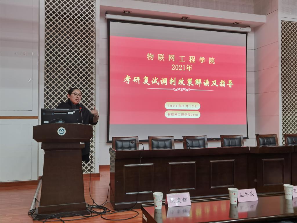 2021年考研复试调剂政策解读及面试指导专题讲座在学院D328会议室举行。此次讲座邀请了江南大学研究生院、学科建设处招生办公室主任周黎担任主讲,院党委副书记、副院长孔丽丹出席活动,谈震锞、张迪、冒宇航等七位同学担任经验分享嘉宾,全体毕业班辅导员及150多名学生到场聆听。讲座由辅导员洪筱主持。