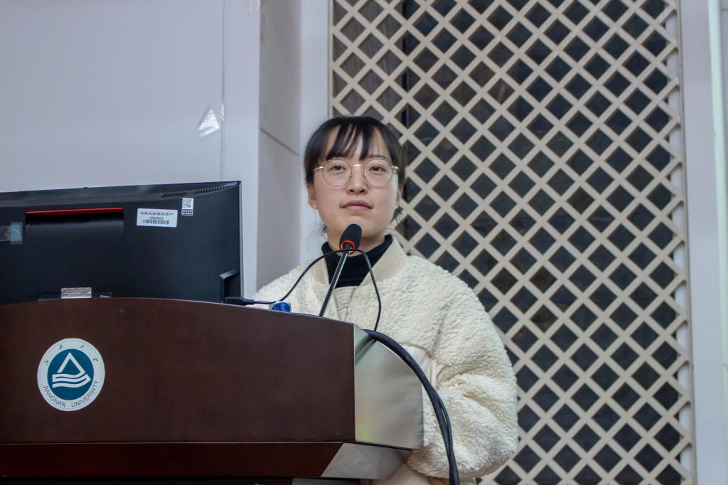 在第二部分中,吴迪老师以“青年与祖国共奋进”为主题,向同学们讲述了我国青年运动的历史。她从古代中国的强盛历史讲起,娓娓道来,阐述了近代中国没落的原因,并谈到了五四青年运动、一二·九运动中优秀青年是如何肩负起救亡兴国的时代重任。她向同学们提出了“紧跟时代脚步,与时代共同奋进”的希望与要求。之后,她特别提到在欧美国家留学期间,感受到外国势力对中国存在很深的误解与偏见,因而号召同学们在外要讲文明和谐,同时主动地维护祖国的荣誉,坚决与无端诋毁中国和中华民族的行为作斗争。