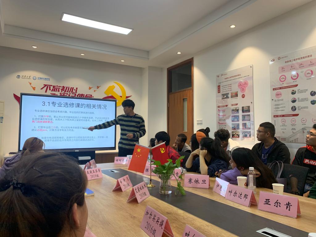 随后,学生代表进行发言。2016级优秀学生代表加尔买买提·艾布德开勒木就自己备考国家电网的经历,从职业规划,考试备考方法等方面全面分享了自己的求职经验,启迪学弟学妹们要及早做好大学生涯规划,确定好自己考研、保研或就业的中长期目标,并将其细化落实在每一个小目标的实现当中。2017级学生代表吐尔逊阿依·吐尔迪作为我们物联网学院老师们人人称赞的学生骨干,从社会工作,职业生涯规划等方面分享自己在江南大学三年以来的深刻体会并祝学弟学妹们学业顺利,愉快地度过自己的大学生活!大学生退役返校学生艾赛吐拉木从他入学再到做入伍决定以及他艰苦又刻骨铭心的军旅生活,他感叹返校之后的江大翻天覆地的变化,并表示,很庆幸自己的青春有军装的样子!从预科班毕业再到物联网学院的2018级学生恰特克,通过幻灯片介绍关于计算机科学与工程专业满满的干货,将本次交流会的气氛带向高潮,现场同学都纷纷拿起手机拍下PPT上的内容,收益颇多。