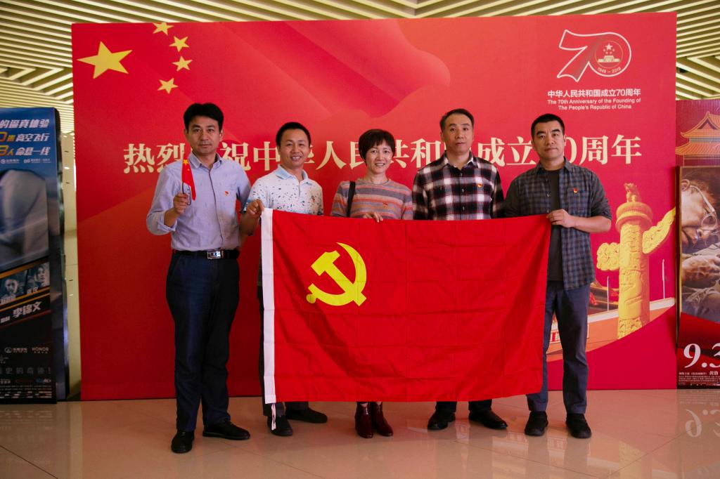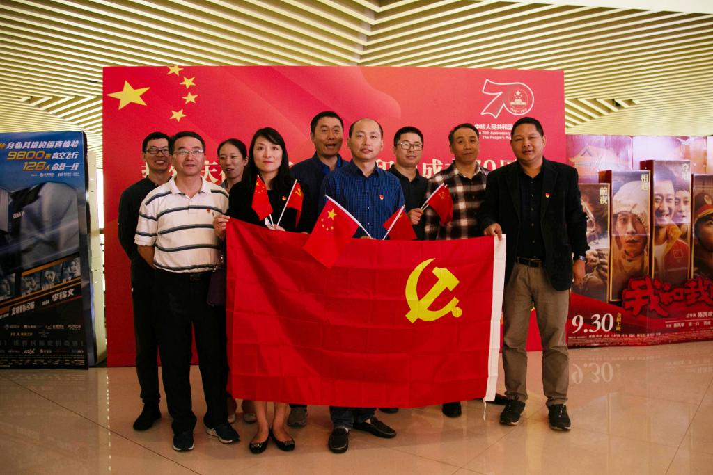 观影前,师生们热情高涨,带着满怀的期待,纷纷前往指定地点等待着这一盛宴的到来。现场氛围活跃,由王志顺老师组织同学为大家分发国旗与贴纸,徽章,随后,师生们纷纷以党支部、系部为单位与党旗、海报现场合影留念。