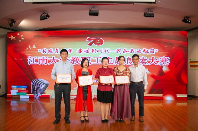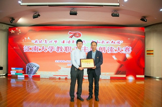 10月11日周五下午14点整,我院教师代表在北区活动中心音乐厅参加庆祝新中国成立70周年“共筑复兴梦 建功新时代——我和我的祖国”主题教职工朗诵活动。本次活动由江南大学校工会、图书馆与档案馆联合举办。校党委常委朱飞、校工会主席冯群康、党委教师工作部部长兼党委宣传部副部长徐锡清、图书馆与档案馆党总支书记曹瑛、原校工会主席施培新、校长办公室副主任王维青等领导出席本次活动,来自全校各分工会的24支代表队及各学院(单位)教职工代表共300多人参加了活动。