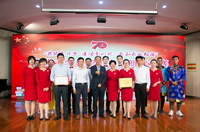 在学院党政领导、工会老师的大力支持下,我院率先启动节目编排工作,题为《我和我的祖国》的参赛节目由洪筱老师主创,孔军、秦宁宁、于凤芹、洪筱、侯玉莹、王雪冰、吴琼、王志国、吴垚、杨兵(排名不分先后)10位老师朗诵,6位少数民族学生担当舞蹈表演工作,新媒体工作室学生参与撰写原创朗诵稿,赛前经过了反复的推敲、练习。参赛现场上,师生们各个热情饱满,激情澎湃,铿锵有力的朗诵配合刚柔有度的伴舞表演,给予在场每个人强烈的视听享受,使观众们油然而生起身为中华民族人民的自豪之情,掌声不断。最终我院的节目以9.92分的成绩一举夺魁,力压群雄,荣获唯一的一个一等奖。与此同时,我院还荣获优秀组织奖,成绩喜人。