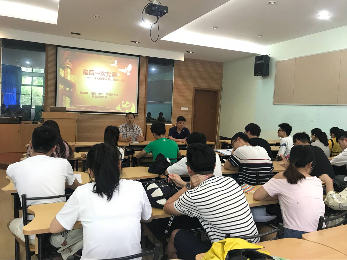 分专业进行了毕业生党员的最后一次党课活动,在江南大学60周年校庆之际,以学生党员为代表向母校建言献策。6月6日下午,在院B109举办了物联网、微电子、通信、电气专业的毕业生党员最后一次党课,其主题为“深化改革开放,培养一流人才”的思想解放大讨论,出席此次会议的有院党委副书记、副院长耿向阳、院党委委员顾晓峰。