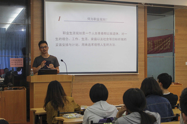 胡老师幽默风趣的语言很快吸引了在座学生们的注意力。讲座中,胡老师首先阐述了职业规划的内涵,即是同学们需要对一生的理念、工作、生活、家庭以及社会等目标作出妥善的安排与计划,从而实现理想人生。同时,胡老师也简要地为同学们解释了职业规划的重要性,并强调了要做好职业规划的原因。