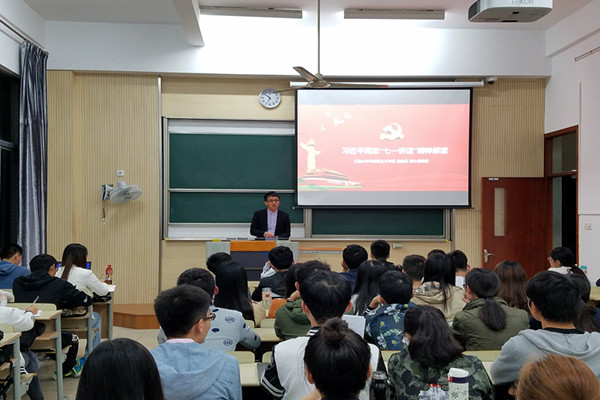 开班仪式结束后,马克思主义学院唐忠宝副教授进行了以习近平同志“七一”重要讲话精神解读为主题的讲座。唐老师以“不忘初心”作为引入点,引经据典、旁征博引,以当下热议的话题为佐证全面透彻地讲述了有关“马克思主义、共产主义、四个自信、全面建成小康社会、全面深化改革、以人为本、和平发展、全面从严治党”的八个“不忘初心”。他着重强调了“信仰”,认为“信仰就是人生存下来的意义,共产主义就是这样一种信仰”。讲座现场因唐老师的诙谐幽默、妙语连珠而笑声不断,最后讲座在同学们热烈的掌声中落下帷幕。