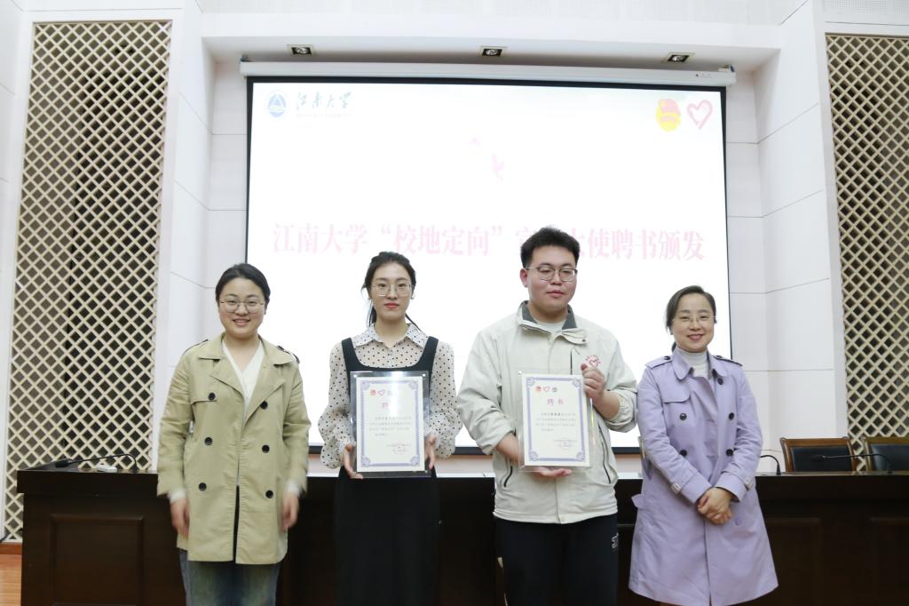 岳天田、霍雷霆依次进行“志愿归来话成长”我的青春故事宣讲。岳天田以《身植基层土,心期万里云》为主题,从岗位工作、职业规划、成长收获等方面倾情分享了自己的志愿经历。霍雷霆以《功成不必在我,功成必定有我》为主题,讲述在本科毕业之际选择西部支教,奔赴云南芒宽,用沾满泥土的脚步丈量祖国大地的动人故事。报告尾声,吴海娇和单云婷为两位志愿者颁发“校地定向”宣传大使聘书。