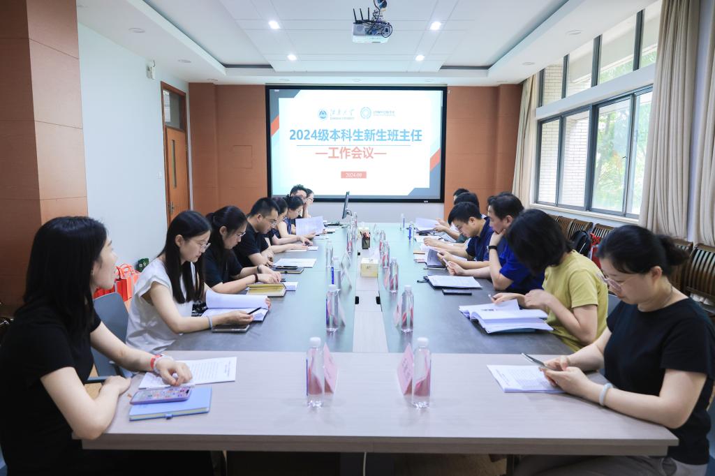 在D206会议室召开新学期2024级新生班主任工作会议。学院党委副书记、副院长孔丽丹,分团委书记兼学工办主任洪筱,学工办副主任李诗炜,2024级新生辅导员李灿、沈滔以及2024级全体班主任参加会议。
