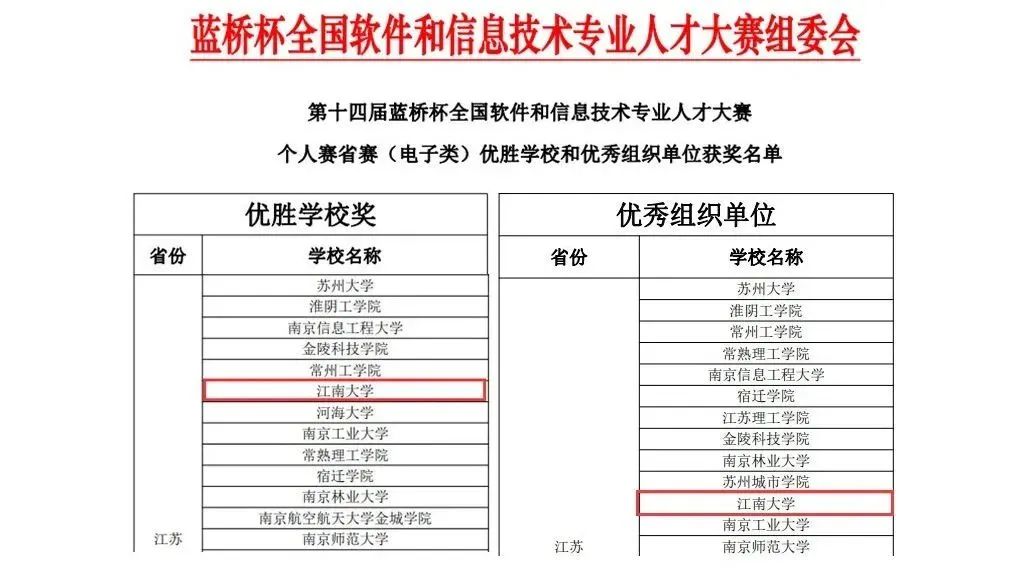 近日,第十四届“蓝桥杯”全国软件和信息技术专业人才大赛江苏省赛电子类赛道落下帷幕。江南学子共获电子类奖项69项,其中一等奖16项、二等奖27项、三等奖26项,16人取得国赛参赛资格,江南大学获评电子类“优胜学校奖”和“优秀组织单位”。