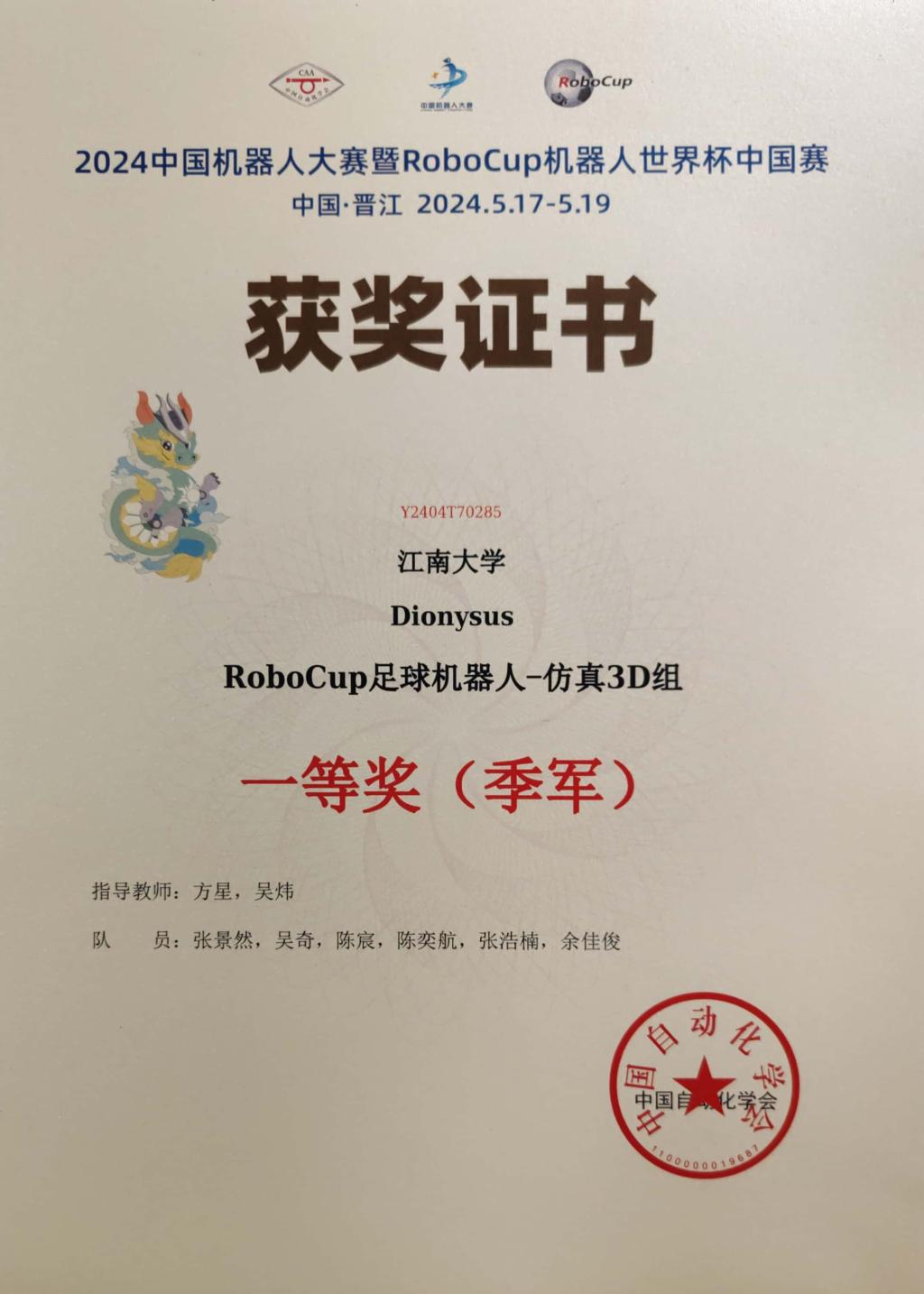 方星和吴炜老师的指导下,由张景然、吴奇、张浩楠、陈宸、陈奕航、余佳俊6名同学组成的团队,不畏困难、勇于实践、敢于挑战,在比赛前全力进行机器人控制程序编制、调试和优化训练,克服了准备时间短、程序编制复杂、机器人数量不足等困难,凭借团队自主创新的代码架构以及顽强的拼搏精神、良好的工程素质和紧密的团队协作,经历校赛、全国赛、32强赛、16强赛、8强赛、半决赛的层层挑战,一路过关斩将,取得9连胜,最终成绩位列全国第3名(季军),荣获全国一等奖,继续刷新我校在该项赛事的最好成绩。