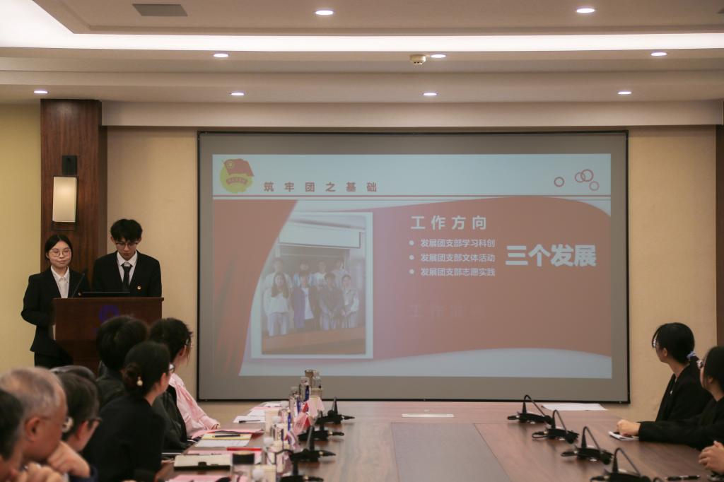 特称团支部争创答辩活动在学院B222会议室成功举行。学院分团委书记洪筱,关工委委员吴锡生、朱凯元、赵曾贻,2023级本科生辅导员李诗炜、谢幸福担任评审,各争创团支部代表70余人参加活动。活动在昂扬的团歌中开始。